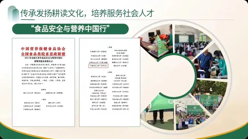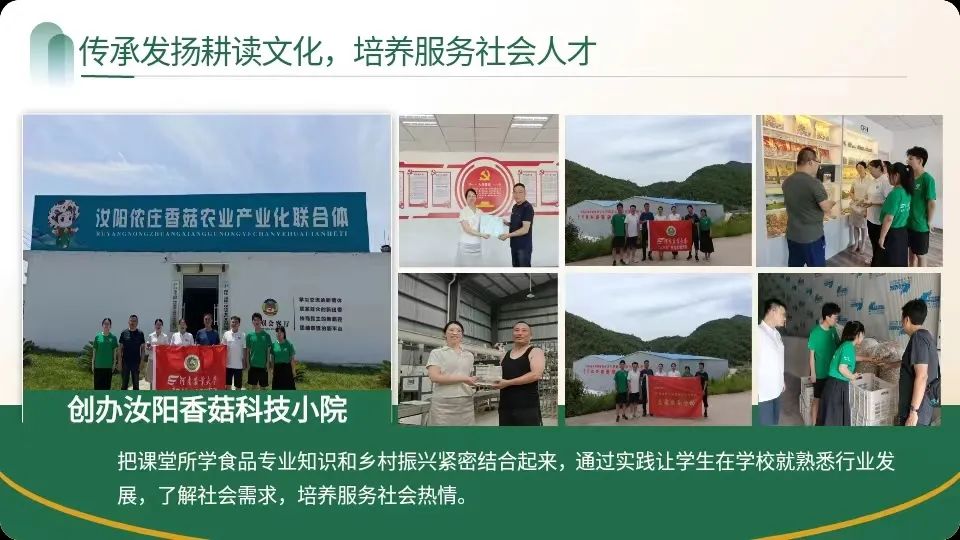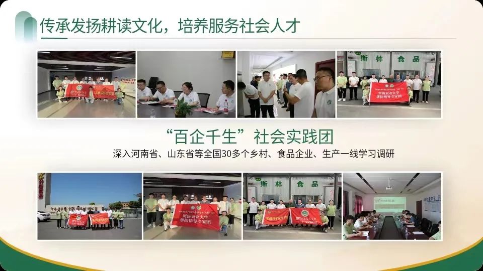 勤耕尚读是我们优秀的传统文化,学院着力引导青年学生走入企业、走向社会,走进一线,用食品安全与营养科普知识服务社会、服务人民,上好“走在中国大地上”的实践大课堂。让学生在冒热气、粘土味的实践中,厚植爱农情怀,练就兴农本领。在全国大学生“食品安全与营养中国行”活动中荣获全国二等奖。“百企千生”社会实践团深入河南省、山东省等全国100多个乡村、食品企业、生产一线学习调研,创办汝阳香菇科技小院,把课堂所学食品专业知识和乡村振兴紧密结合起来,通过实践让学生在学校就熟悉行业发展,了解社会需求,培养服务社会热情。培养出致力于食品行业发展的三全技术中心主任冯志强、广州立白集团公司省区经理苏建强等企业骨干;带领乡亲们致富的西平县蔡寨乡人大主席陈克战、兰考县葡萄架乡党委委员卜大品等基层就业先进。