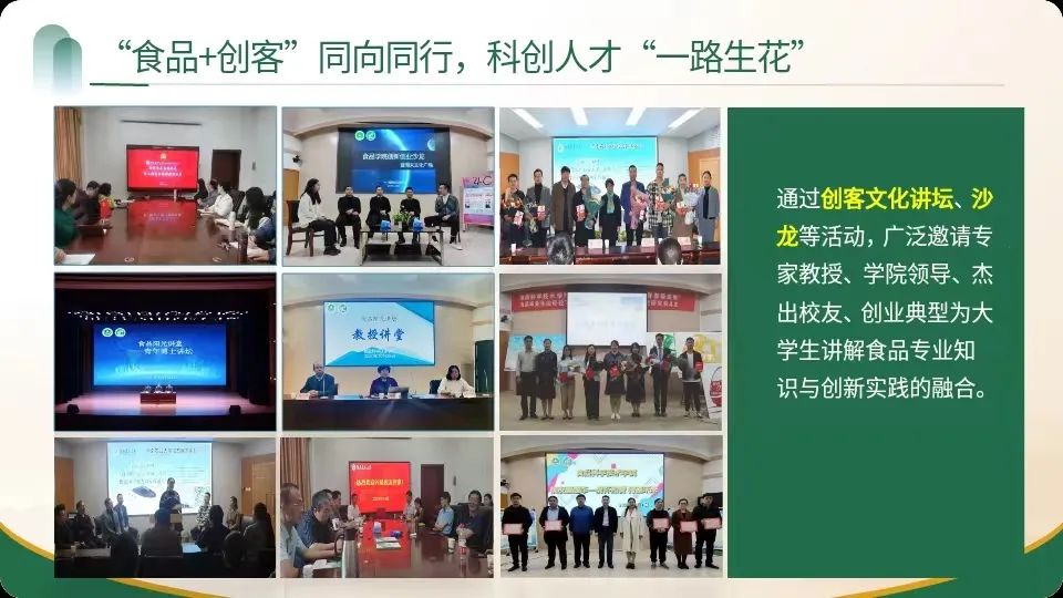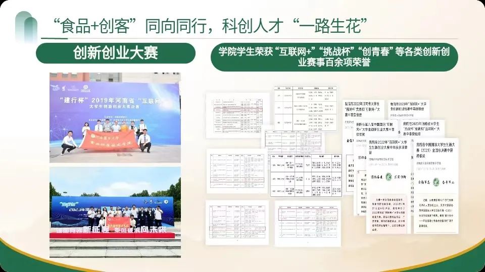 学院坚持“传承与创新”融合,着力营造青年创客文化,通过创客文化讲坛、沙龙等活动,广泛邀请专家教授、学院领导、杰出校友、创业典型为大学生讲解食品专业知识与创新实践的融合,打通服务专业置之以行的“最后一公里”。立足学院特色和专业优势,举办“传统美食创意大赛”、“食品百科知识竞赛”、“科萌杯”创新创业大赛等各项赛事,实现创新和实践相配合,形成浓厚创业氛围。学院学生荣获“互联网+”“挑战杯”“创青春”等各类创新创业赛事百余项荣誉。培养出河南省大学生创新创业标兵樊鹏飞,李向阳、赵佳琪等创业典型,创业项目均实现营业额1000万以上。