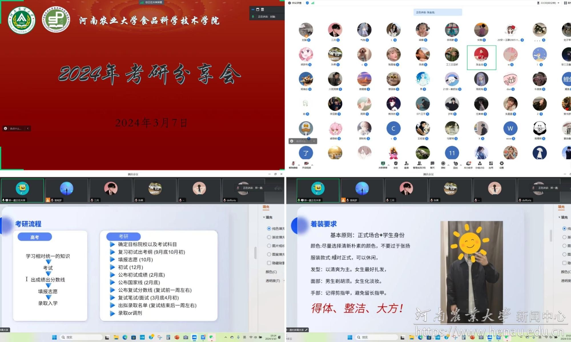 本次讲座邀请了中国农业大学、中国农科院等5所高校、科研院所的11名往届考研上岸学长、学姐分享考研复试经验。他们结合自身的考研经历,向学弟、学妹们详细地介绍了考研复试准备和调剂院校等方面的内容,建议大家要合理规划学习时间,结合自身情况,对学习计划进行调整。同时还从不同院校复试特点介绍了复试与调剂流程,提出既要关注书本知识,也要关注实验操作,劳逸结合、细致认真做好复试准备。此外,还用实际案例强调了考研面试时语言和着装等方面的注意事项。与会学生纷纷表示获益匪浅,将结合学长、学姐的建议,认真准备考研复试,力争考取自身满意的学校。