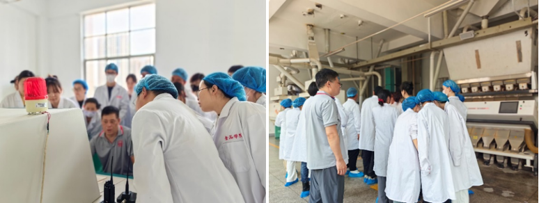 学生们按照生产实习任务安排,首先对金苑全厂总平面进行了实地测量和绘制工作,包括厂区道路、建构筑物、绿化等方面的设计,加深了对食品工厂总平面布局的理解和认识;其次,学生们深入制粉车间进行参观学习,从原粮接收到小麦清理,再到小麦制粉工艺,从设备选型到物料走向,再到参数设置等,以小组合作的方式,进行测量、记录、学习;遇到不懂的地方,及时向车间工作人员虚心请教,脚踏实地地将大学所学理论知识与生产实践相结合,系统学习了小麦制粉的相关知识。最后,在每周汇报过程中,同学们对每周的实习收获进行了展示、交流和讨论;并通过李梦琴教授的解答,对小麦清理流程和制粉工艺流程等方面有了更加完善的认识。