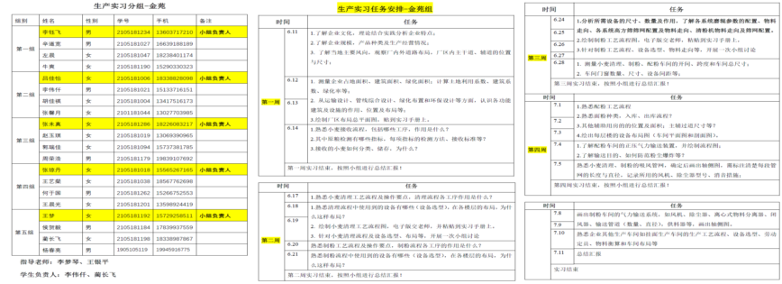 为了帮助同学们顺利完成为期4周的生产实习工作,学院教学院长张剑提前协调,亲自到厂与金苑粮油有限公司曹总和各部门领导商谈了具体实习内容;并由带队老师给实习生们进行分组,根据实习内容制定详实的实习计划,具体到每日计划、每周总结,要求学生相互学习,相互支持,以提高他们的团队合作意识。确保学生实习的每一天都能有所收获,提高工作效率,及时总结反思,做到今日事今日毕,切实保障实习的顺利进行。
