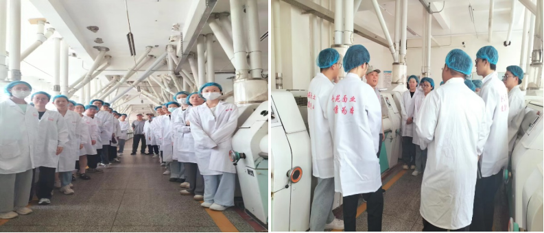 学生们进入企业后,首先由崔慧霞主任向学生详细介绍了河南金苑粮油有限公司的黄漫、生产规模及产品种类等。崔主任指出金苑始终坚持“以质量求生存,以信誉求发展”的经营理念;采用国内先进的生产工艺,将优质小麦进行合理搭配,生产出符合市场需求的高质量专用粉、民用粉和挂面等。其次制粉车间孟伟主任向学生强调了进入制粉车间的安全和卫生方面的要求,要求学生严格遵守企业规章制度,需在更衣室换好实验服、戴好头套、脚套后进入车间,保证车间卫生质量,同时需注意个人安全,车间内未经同意不得私自开启或关闭生产设备等。接下来孟主任带领学生到达制粉车间中心控制室,通过自动化控制软件向学生们详细介绍了小麦清理流程、制粉工艺流程和配粉环节等,使学生们更加明确了本次生产实习的内容和任务。