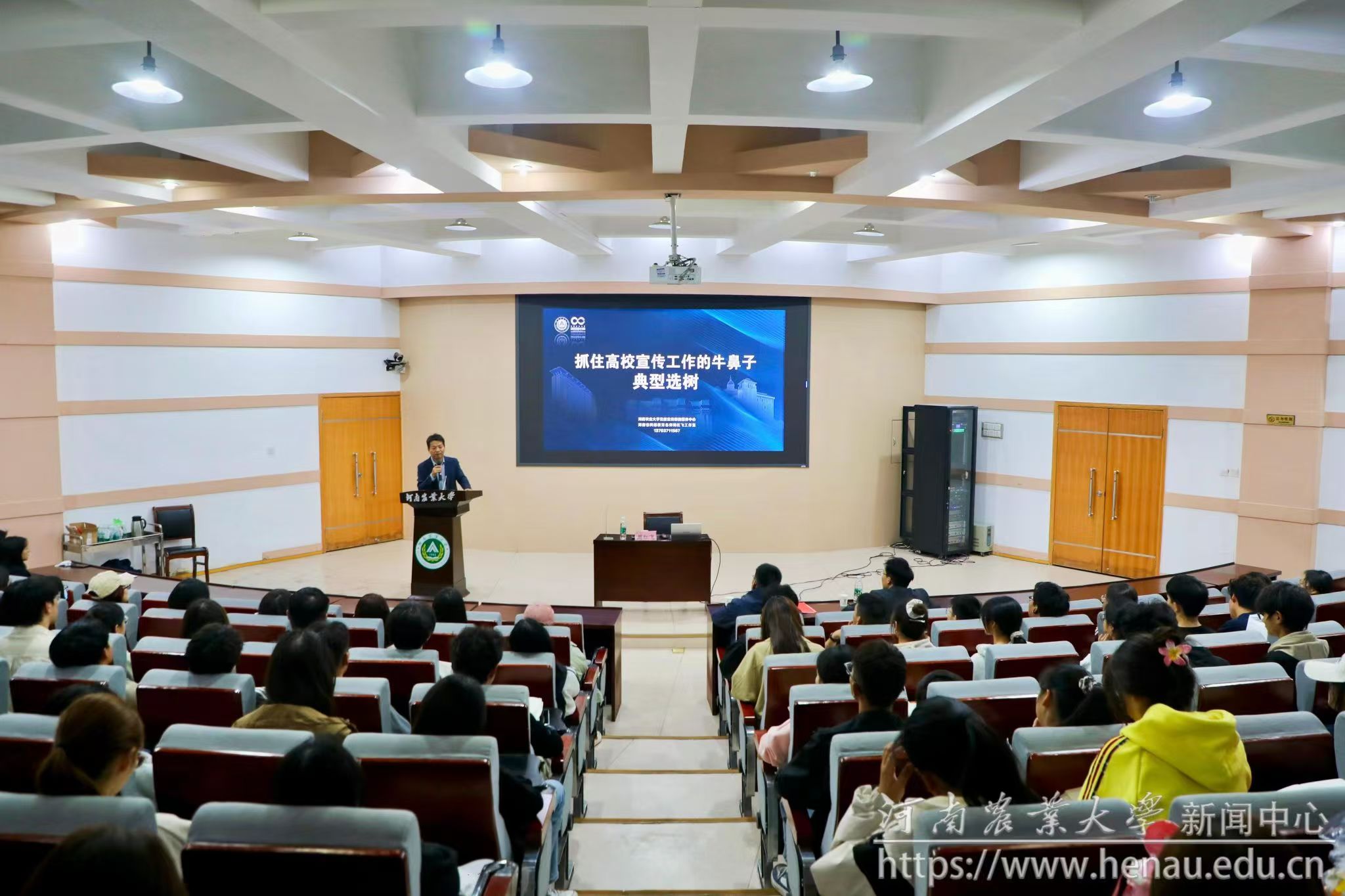 培训会上,周红飞以《抓住校园宣传工作的牛鼻子——典型选树》为题,结合自身从学生记者到毕业后在校工作的经历与现场师生进行了分享,鼓励同学们自觉增强自身新闻宣传能力,为学院的新闻宣传贡献自己的力量。他从新闻的“中心与大局”“人物通讯”等方面为大家详细讲解了新闻写作知识,通过对打造“中国好XX”系列、“虫子教授”杨森、八百里伏牛山上的“点金师”以及100秒打造“河南最美”女教师等我校真实新闻案例分析,让与会师生更加切实地了解了如何撰写引人注目的新闻标题,构建清晰的新闻结构,捕捉精彩的新闻瞬间以及正确的、高效地利用新媒体平台进行信息传播。周红飞勉励同学们在今后的工作中利用好网络新媒体力量,积极传播社会正能量,推动学院工作的开展。
