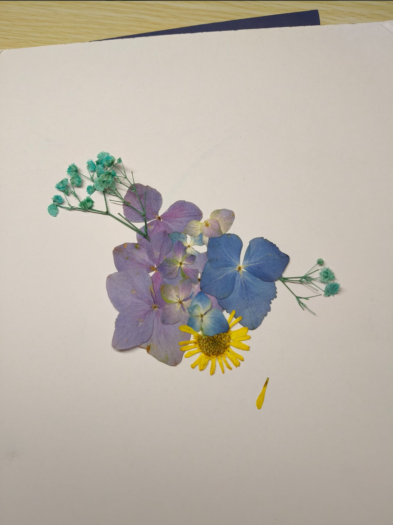 这是一幅精美的压花作品,由黄色、紫色、蓝绿等色彩丰富的干花精心拼贴而成。黄色干花或许是金盏花,有着独特的药用价值;紫色的可能是玫瑰花瓣,浪漫且香气宜人;蓝绿色的可能是染色的满天星,梦幻而别致。