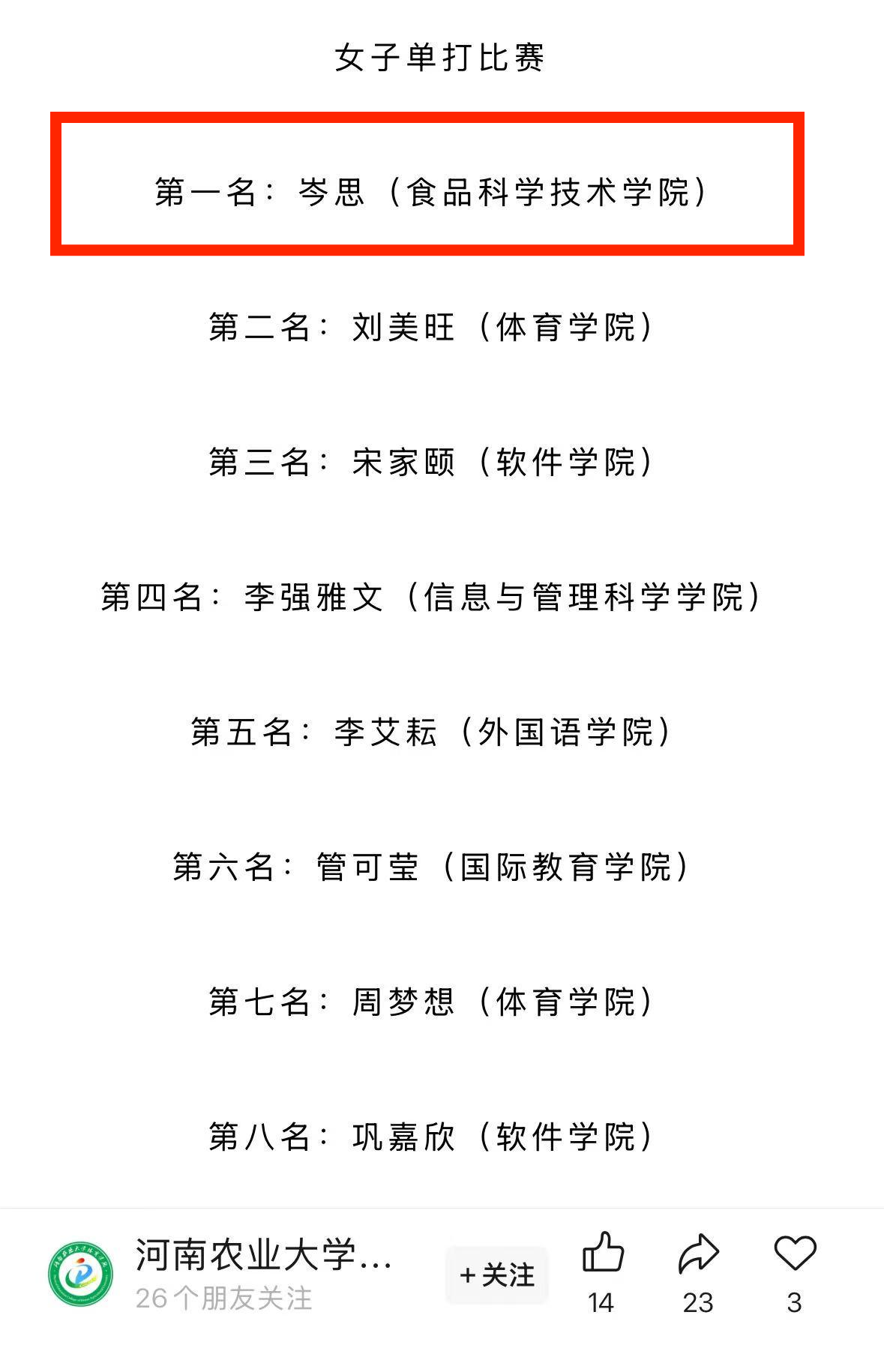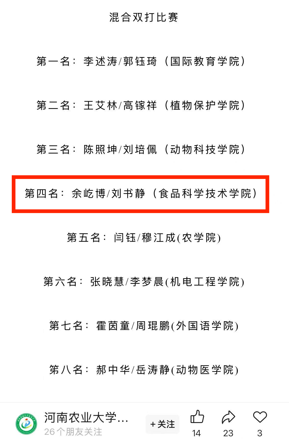 荣获团体比赛第一名。 此外,在单项比赛中,岑思同学斩获女子单打桂冠;余屹博与刘书静组合获得混合双打第四名。