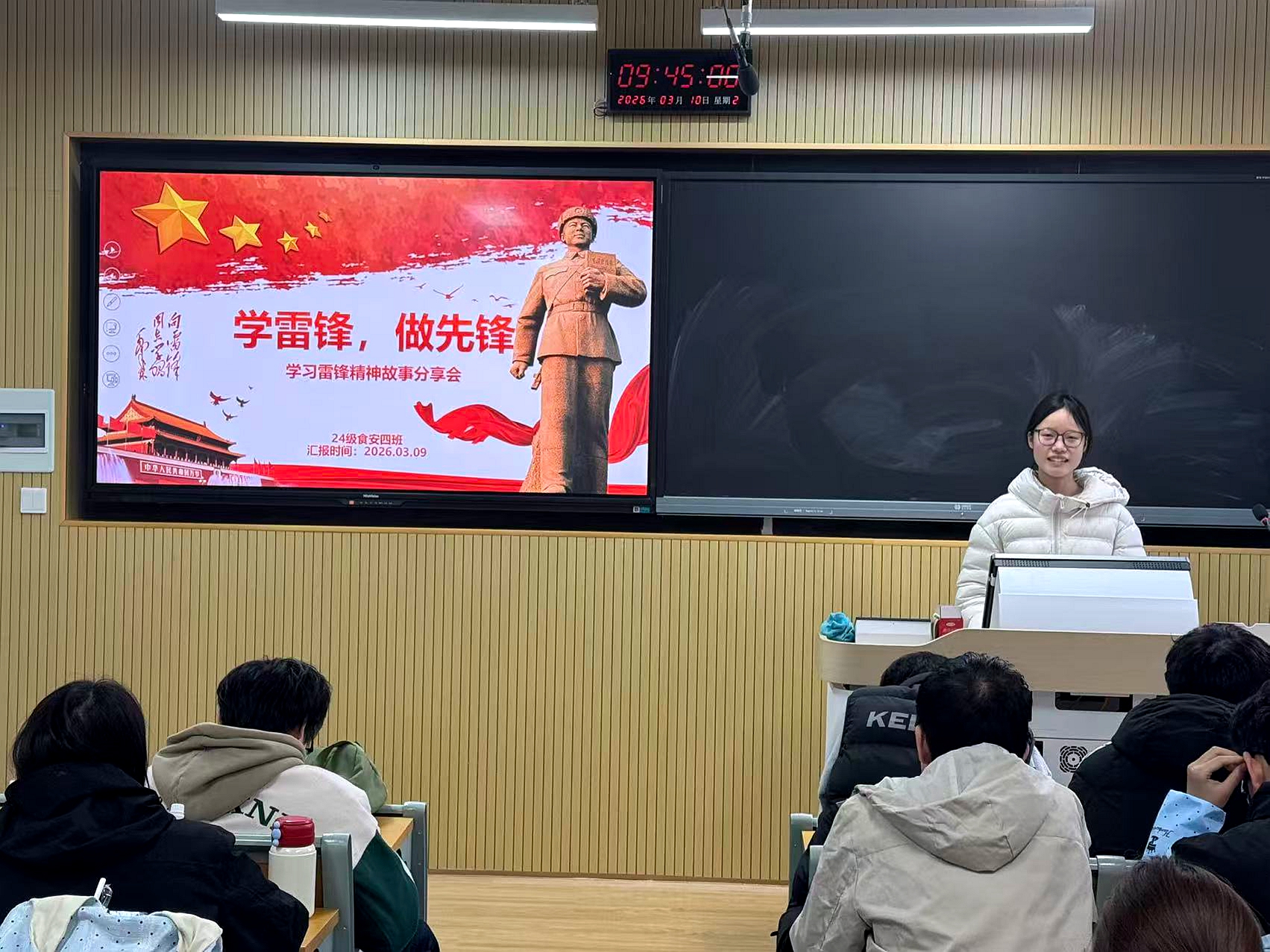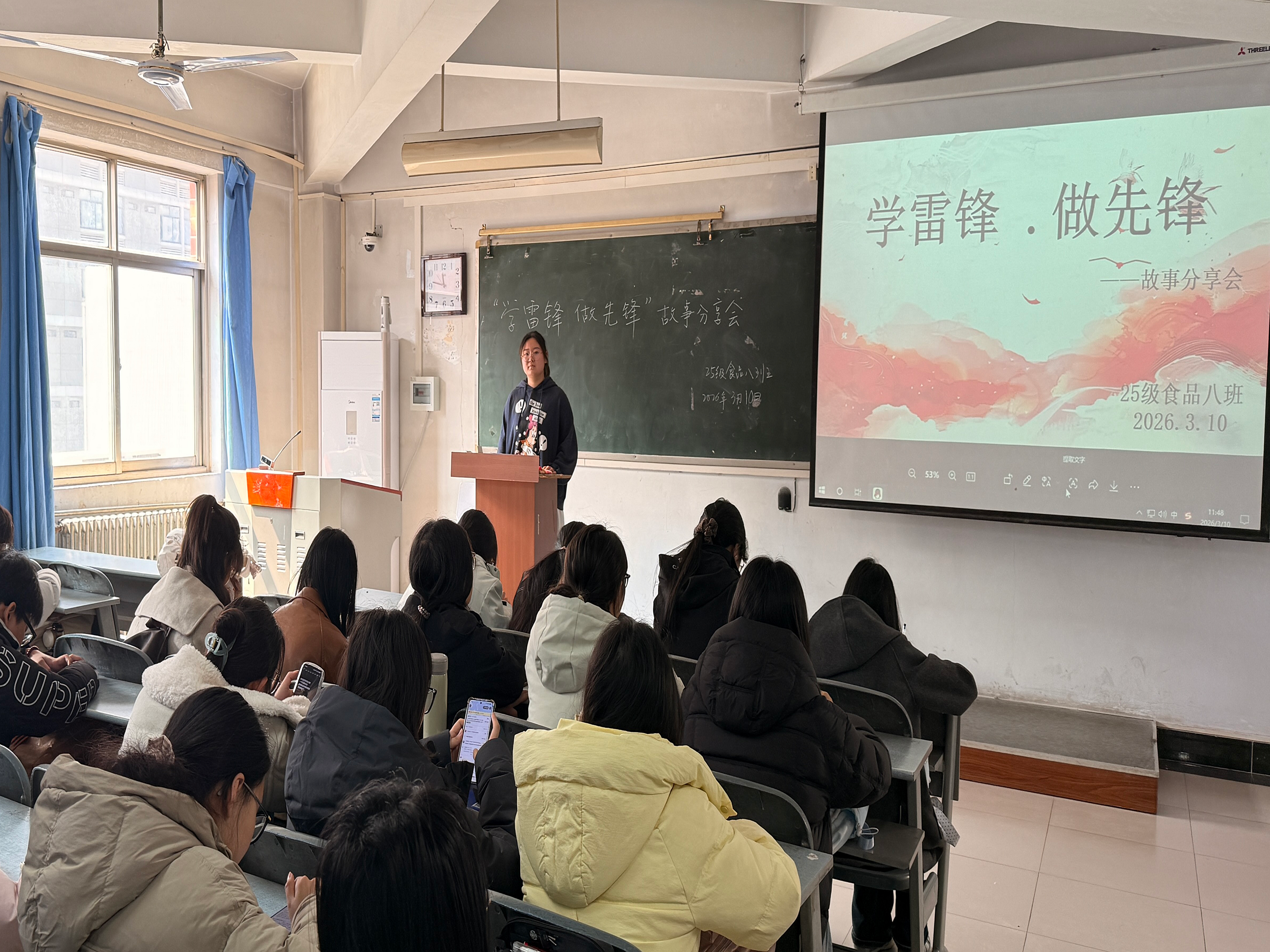 活动期间,各班级围绕志愿服务主题,组织同学们学习相关政策文件,解读新时代志愿服务的意义与要求,帮助大家进一步理解雷锋精神的时代内涵。在故事分享环节,同学们结合自身参与的社区服务、助老助残、公益宣讲等经历,讲述了志愿服务中的所见所闻、所感所悟。一个个真实鲜活的故事,展现了青年学子在服务他人中收获的成长与感动,也在班级内部营造了“学榜样、做先锋”的浓厚氛围。