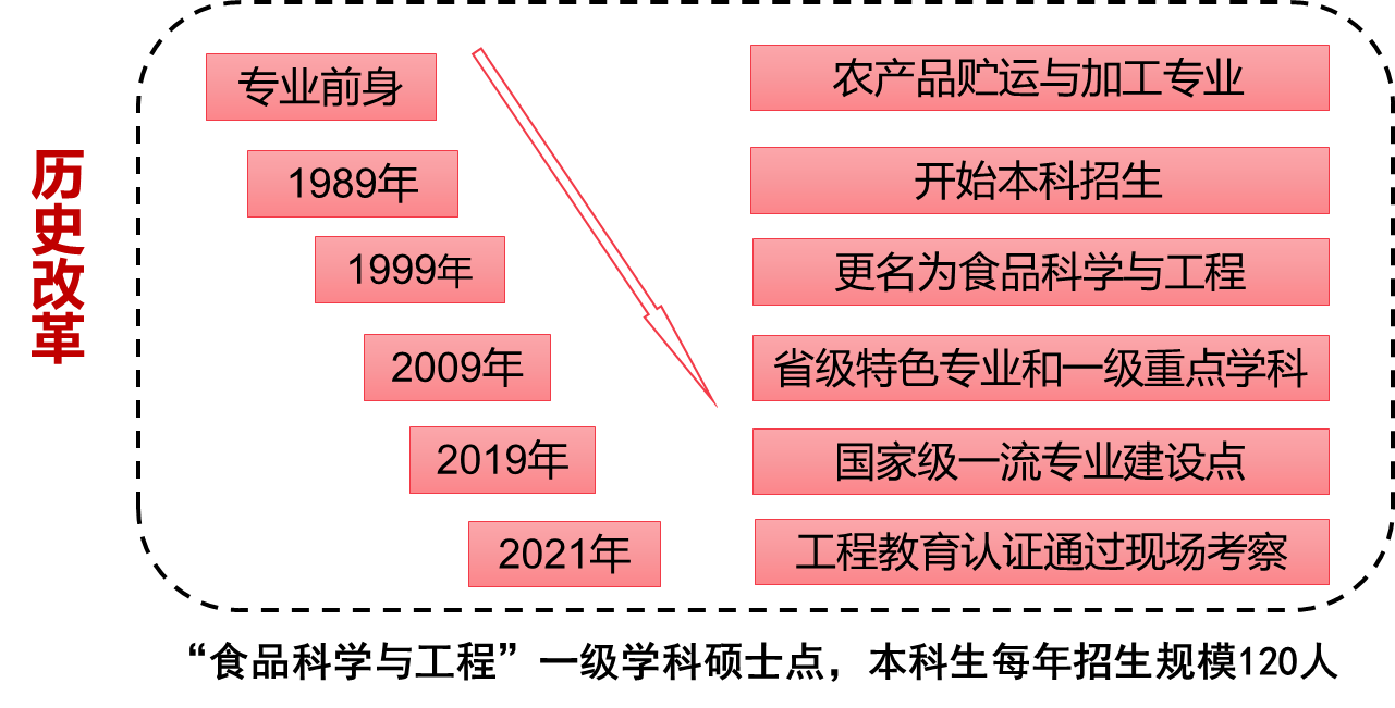 专业基本情况:食品科学与工程专业前身为农产品贮运与加工专业,1989年开始本科招生,1999年更名为食品科学与工程专业。2009年被评为河南省特色专业,2019年被评为国家级一流专业建设点。食品科学与工程专业是河南省农业高校第一个国家级一流专业,也是我校首批5个国家级一流专业之一。经多年积极准备,2021年食品科学与工程专业的工程教育认证成功通过。