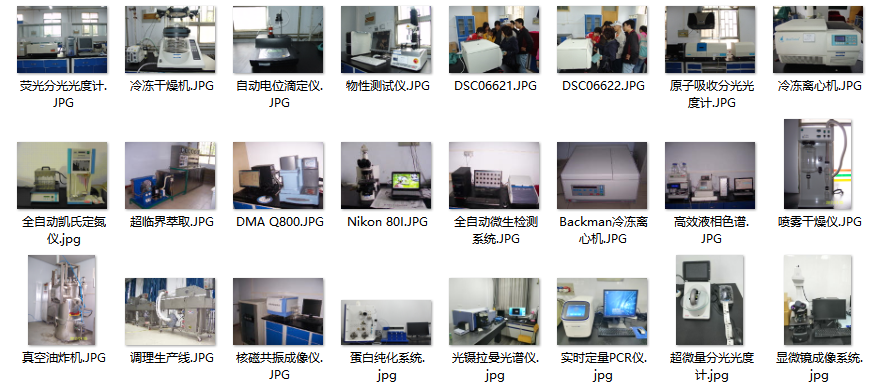 实验室现有面积2500平方米,仪器设备1482台套,总价值3820多万元,其中有动态力学分析仪(DMA)、物性分析仪、微生物培养自动分装设备、光镊拉曼光谱仪、红外分析仪、电子舌、实时定量PCR仪、超微量分光光度计、全自动凝胶成像系统、液质联用仪、气质联用仪、激光扫描共聚焦显微镜、全自动吹泡仪、冷冻多功能实验仪、流式细胞仪等20余件大型仪器设备。